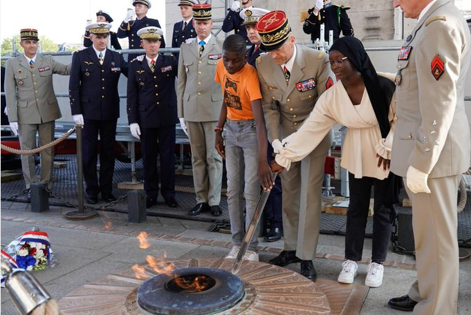 Car j’ai vu comme tout le monde cette fatma voilée raviver la flamme du Soldat Inconnu sous l’Arc de Triomphe le 14 juillet! Une ignominie de plus, une trahison de plus de la part de ce batard de Macron! Bon, que cette fiotte (les tahitiens l’ont bien marqué avec son collier pour pédales!) nous mette bien profond, c’est son boulot, il est là pour ça, il a été élu pour ça non?