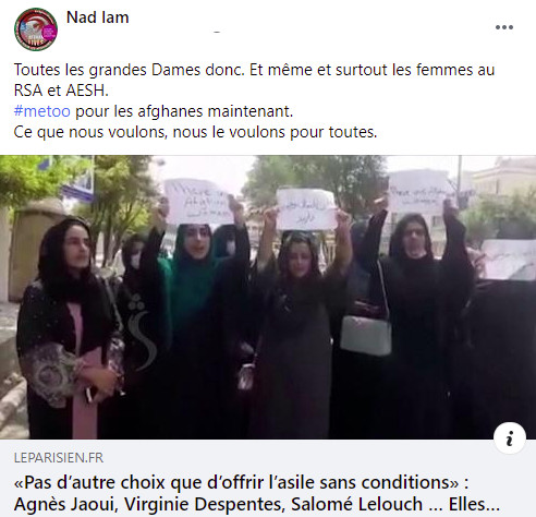 Ce site est animé par une harpie complètement déjantée, une certaine Nadia Meziane, qui bien sûr ne veut pas vivre dans son si beau pays (devinez lequel…) et préfère venir en France profiter de notre si beau système social… tout en crachant sur les français! Cette gourdasse s’est fait remarquer il y a quelques jours en appellant à accueillir des femmes afghanes (attention, pas chez elle, pas folle la guèpe! Chez les autres!).