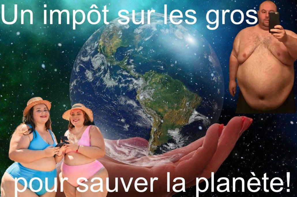 Alors j’ai une idée qui va vous montrer d’une part que je suis pas un gros con (1m80 75 kilos hein!) et que d’autre part je m’inquiète de la planète non mais! Voilà, je propose, non, j’exige que les gouvernements du monde entier imposent un impôt carbone sur les gros! Une somme fixe par kilo au-dessus d’une limite qui dépend de la taille! Et voila, Gréta peut retourner à ses chères études, Marcel aura sauvé la planète!