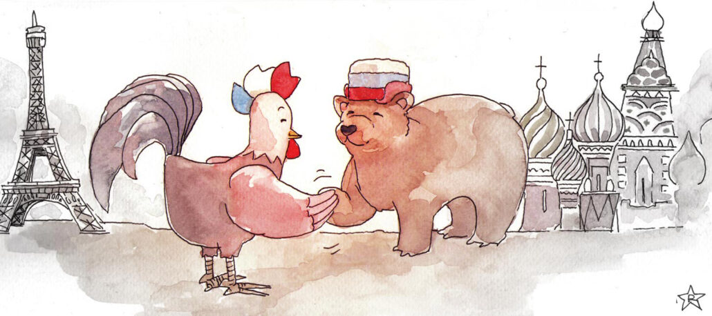 Bref vous avez compris, la Russie va attaquer la France ! Alors moi je me souviens des histoires qui se racontent au Village, par exemple que quand en 1814 les russes étaient à Paris, ils aimaient aller dans les cafés pour boire ! Donc c’est des bons gars, c’est obligé ! Puis pour faire accélérer le service ils criaient « Bistro, bistro » ! Parait que ça veut dire « Vite » en russe ! Et c’est pour ça qu’on appelle maintenant nos cafés des Bistrots ! Vous vous rendez compte ? Notre Bistrot doit tout aux russes !