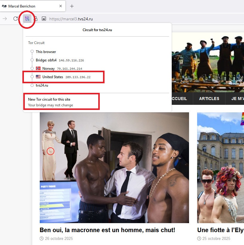 Dans l’image ci-dessus vous voyez que mon noeud de sortie est aux États-Unis. J’arrive sur le site de Marcel sans problème. Si vous voyez que le noeud de sortie (le dernier juste avant « tvs24.ru » est en France, cliquez juste en dessous pour CHANGER le circuit. Le noeud de sortie devrait alors changer. Si le nouveau circuit sort également en France, recommencez.